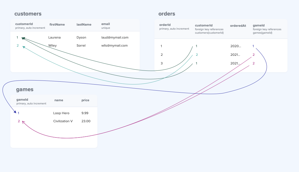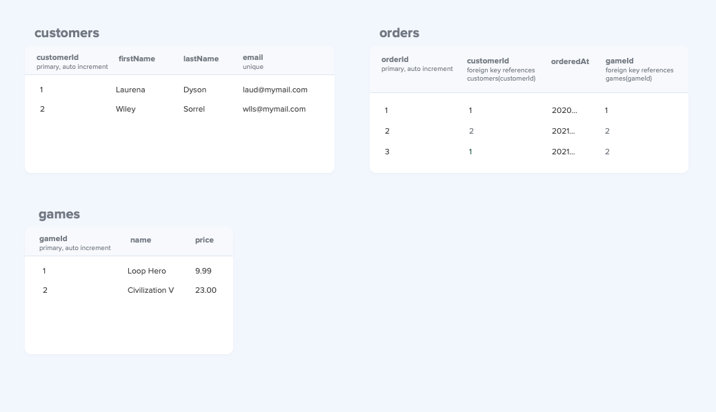 | orderId (primary, auto increment) | customerId (foreign key, references customers(customerId)) | orderedAt | game | price |
