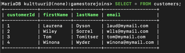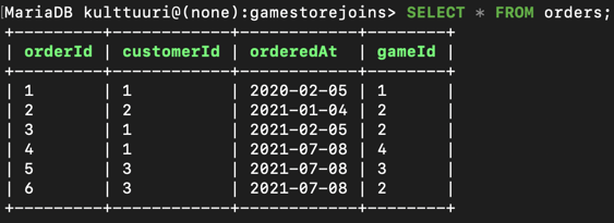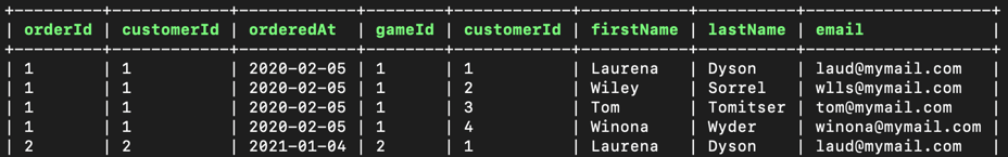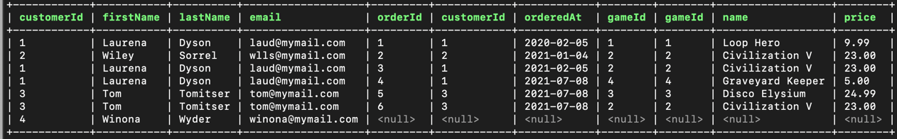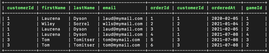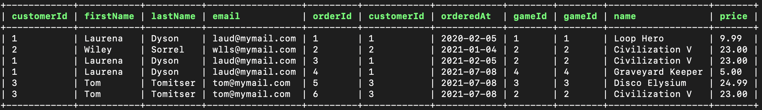 OK – we can see that there are 4 customers, 4 games and 6 orders made. So the question is, how can we easily see for example what orders have the user Laurena Dyson made?
