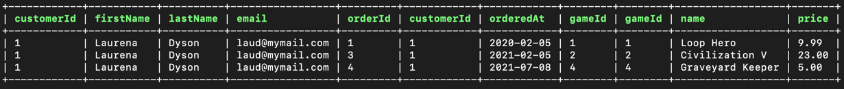 For example, to only get orders (and game information) for a customer that has a name Laurena, we could do this: