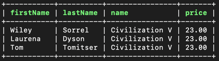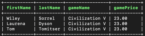 With this query, we will only get firstname, lastname, game name and game price for each record: