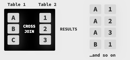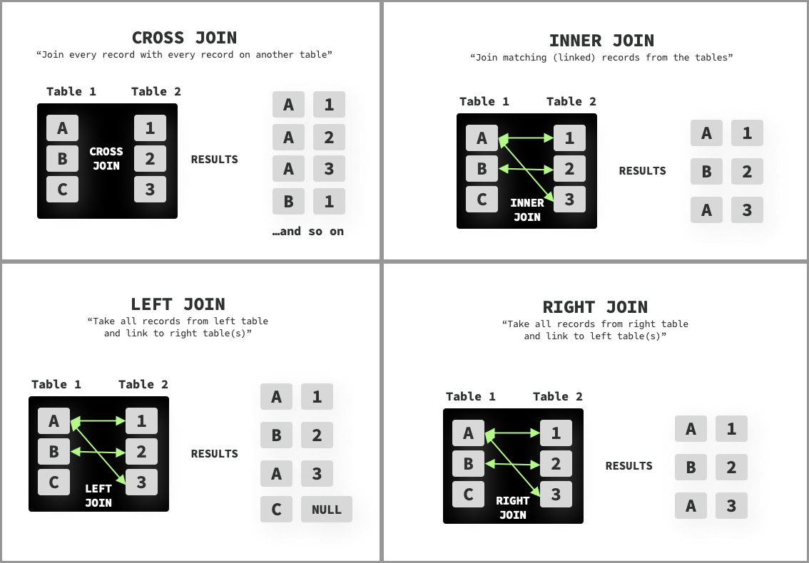 - CROSS JOIN: Combines records from all tables. Very rarely used.