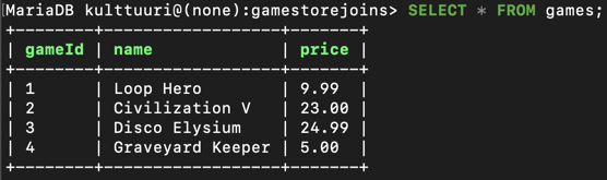 Great! Now let's first use the command SHOW TABLES to see all the tables. We can see that there are the customers, games and orders tables.
