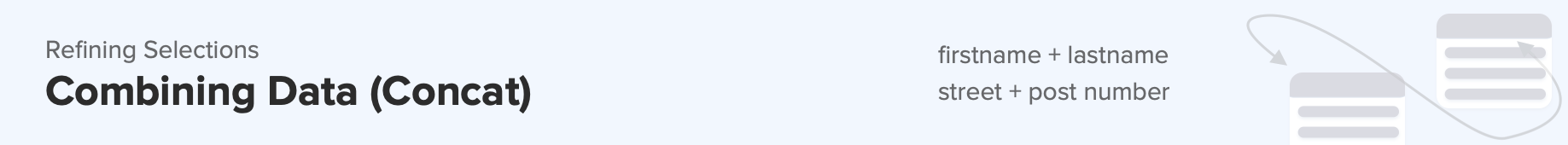 With SQL it is also possible to combine data into one using the function concat. For example, to combine the firstName and lastName of the user into one field called name, we could do this: